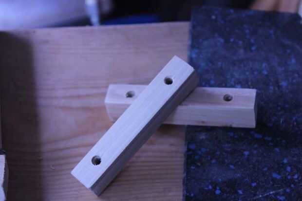 Para evitar que el brazo de lanzar flotando sobre el eje de pivote utiliza 2 espaciadores en cada catapulta. Taladré los orificios de la misma manera que los lados. Luego corte los por la mitad. Ahora deslice el perno de eje en el orificio y añada a los separadores en el medio. Empuje el perno a través de todo el camino y luego agregar pegamento a los espaciadores. Con abrazaderas de resorte, mantienen en su lugar y deje seco 1 hora debe ser suficiente.