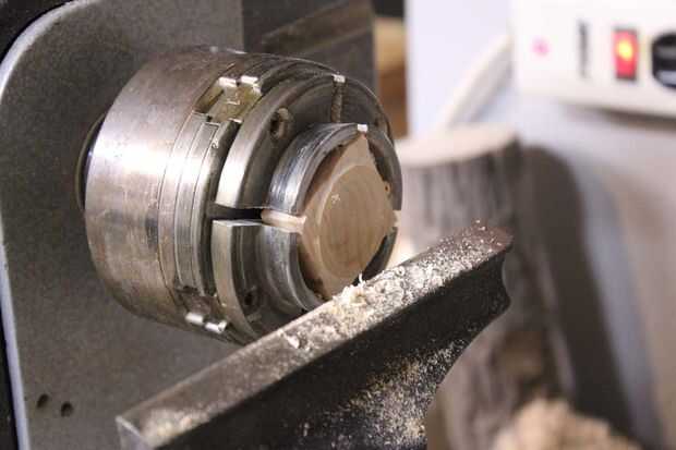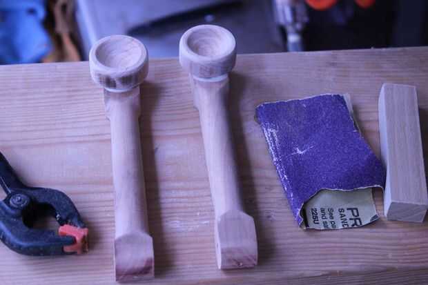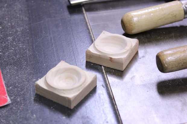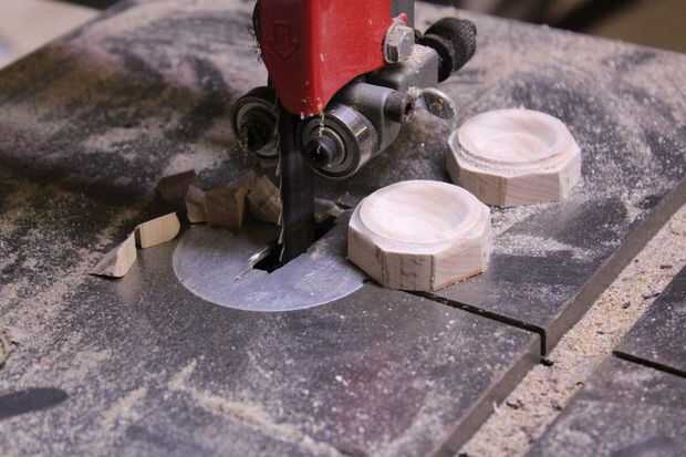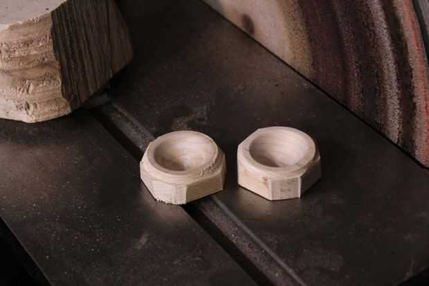 Ahora utilicé 1 1/2 "X 1 1/2" X 3/4 "stock para las copas. Yo había montada en el mandril y una gubia pequeña uña para plato hacia fuera en el medio luego lijado el interior de la Copa. Luego llevó las tazas de bola a la sierra y quitado la mayor parte del material necesario para darle forma redonda. A continuación, usando la lijadora de disco, doblé todo a la forma y luego un final acabado arena para ellos.