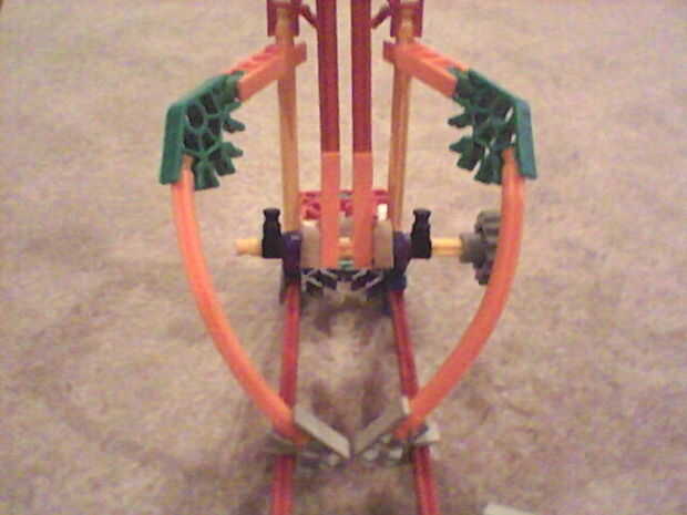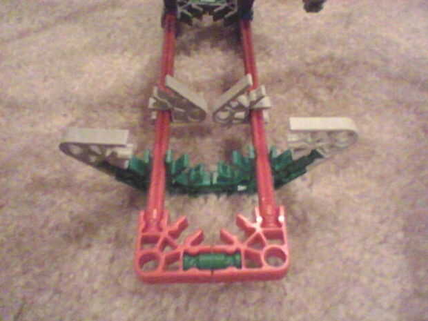 Colocar el otro dos asambleas con las barras naranja flexible a las dos barras amarillas verticales y las dos varillas naranja demasiado gris claro las piezas en el interior de las dos barras rojas. Deslice las dos piezas gris para hacer los montantes perpendiculares demasiado la parte inferior del cuerpo.