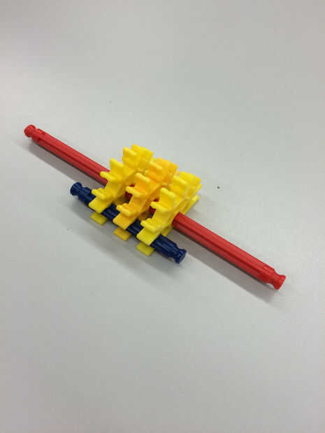 Inserte la varilla roja pasada por el orificio central de 3 conectores amarillo. Luego conecte la varilla azul 1 hasta el final de los 3 conectores amarillo como se muestra.