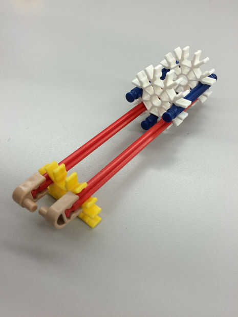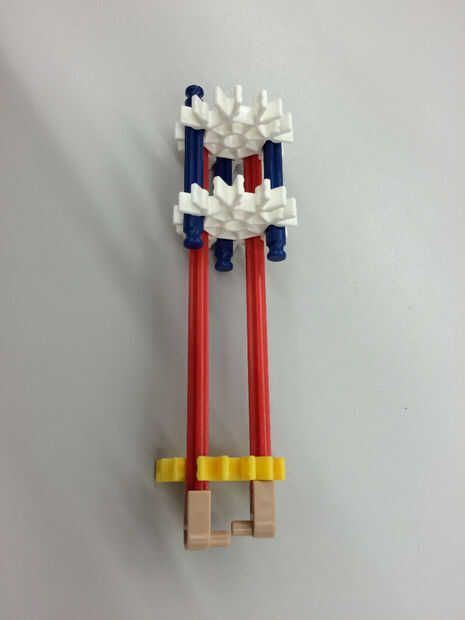 Conecte un conector amarillo a las dos barras rojas en el extremo opuesto de la de final de la cesta y luego conecte un conectores tan en el extremo de cada barra rojo.