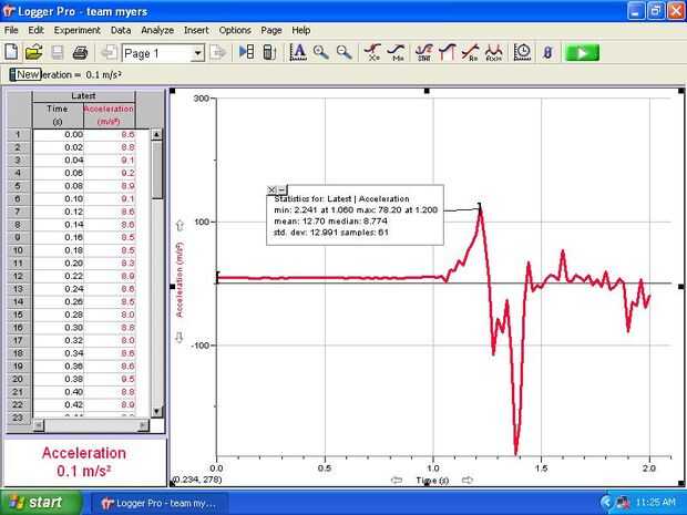 Segunda ley de Newton muestra que la bola se vuelan como las moscas del brazo, pero tienen tanta aceleración como el golpe en el tablero de la parada. El gráfico muestra cómo la bola debe han volado a 76 metros por segundo. Con nuestra prueba final, la pelota voló 22,8 metros antes de aterrizar en el suelo. No la mejor catapulta en la clase, pero funcionó. Bueno para mi :)