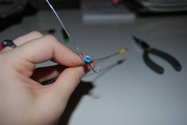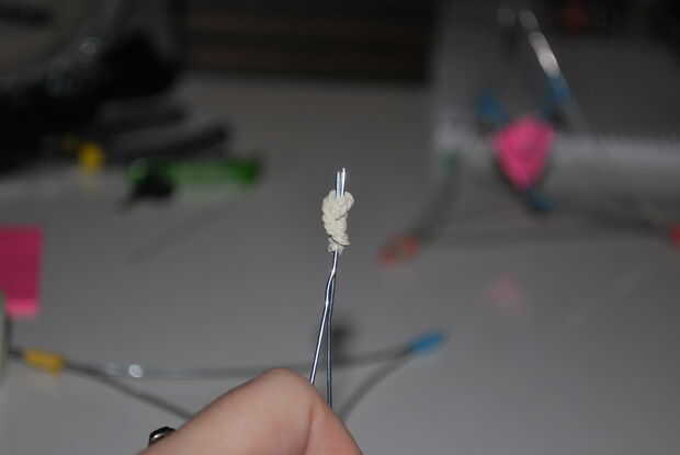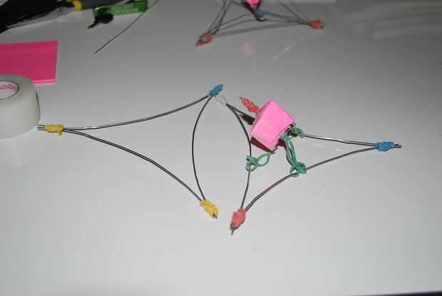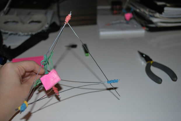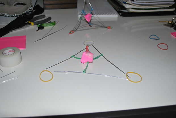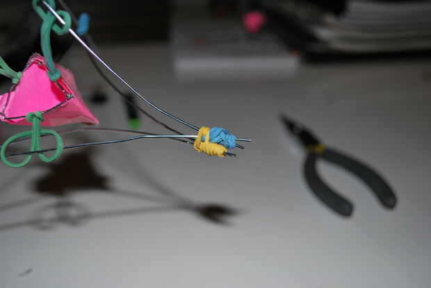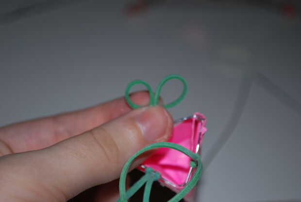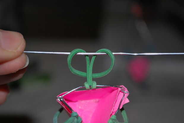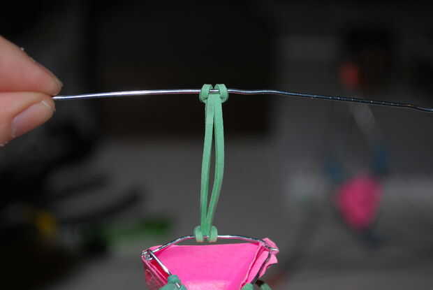 Puso su cesta en los clips antes de colocarlos juntos en el triángulo superior. La forma más fácil que hacer el es doblar la goma así que tienes dos lazos y luego deslice el clip a través de los lazos de manera que y apretar la goma. Esto hace que otra cabeza de alondra.