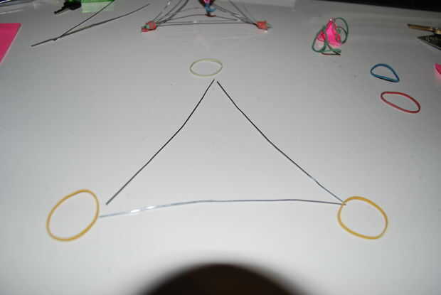 Coloque sus dos triángulos en las esquinas inferiores. Si usted es como yo y tenga una escasez de bandas de goma, hacer cierta holgura en las bandas de goma existentes y utilizarlos para conectar las esquinas. O se pueden encontrar sólo dos gomas más.
