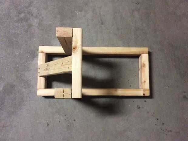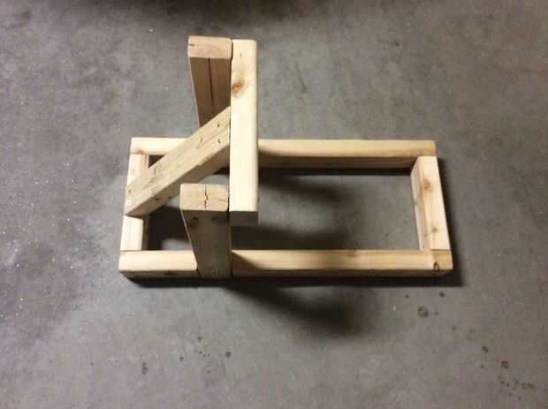 Un ángulo en la pieza de 14 pulgadas de madera de corte y perforación en el lado exterior de la catapulta. Esto proporciona fuerza a su catapulta.