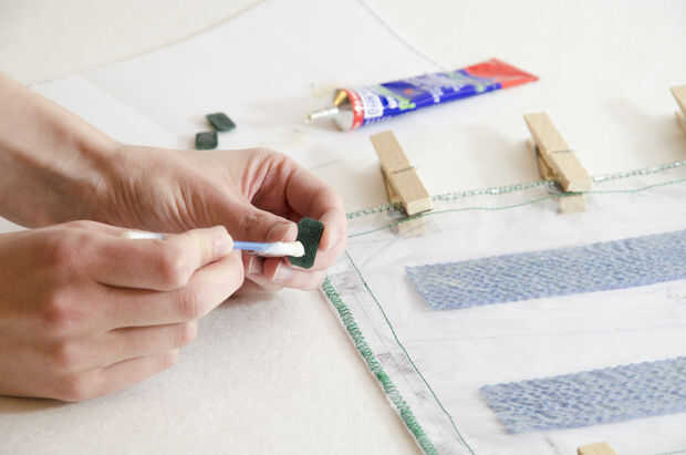 -Para unir los módulos, tienes que cortar 8 rectángulos de velcro 2x1cm: pega 6 de ellos a lo largo del perímetro de la envolvente y las 2 restantes en el borde reforzado (para cerrar el módulo).