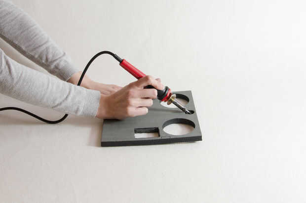 - Grabado el cojín gris con un pyrograph para obtener el espacio necesario para que el altavoz de 16 mm.
