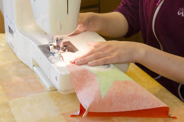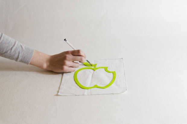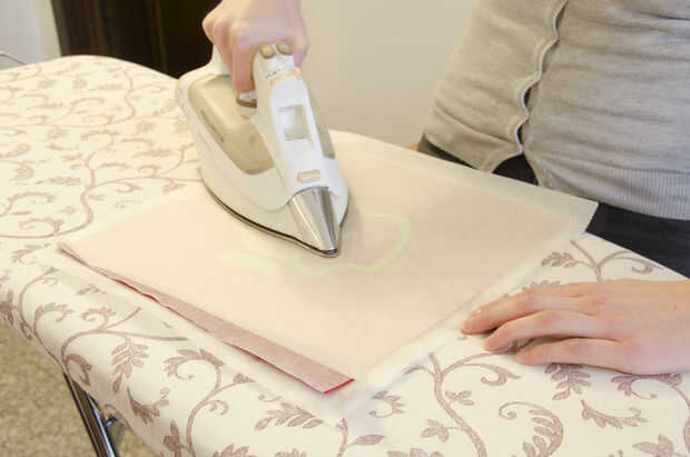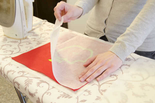 - Componer el patrón en el reverso, establecen el papel térmico (el lado brillante del papel hacia el fieltro), cubrir con una hoja de papel (para evitar que la tela se pegue a la plancha) y hacer el planchadode la hornada.