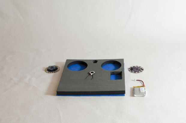 -Tomar dos plásticos rígidos cajas (utilizamos el envase de goma de mascar pero sería mejor usar un cuerpo más rígido). Cortar las cajas tan altas como el espesor de la almohadilla gris, estas cajas se utilizará como cubierta para la electrónica. Los cortes circulares en el cojín gris podrían tener diámetros diferentes, dependiendo de la cobertura elegida.