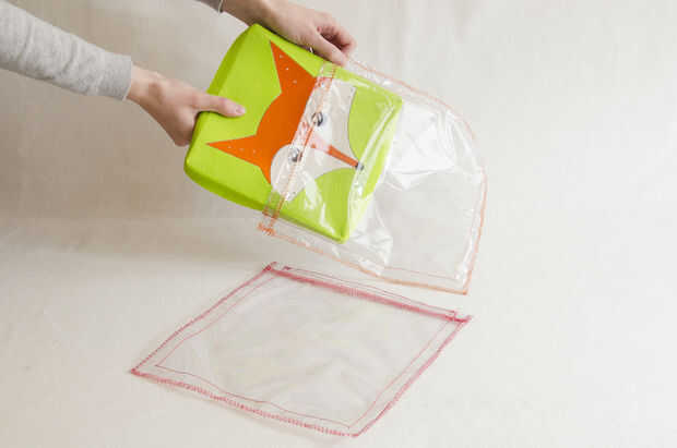 -Tome el abrigo de PVC transparente, cortar en 2 partes con el fin de obtener 2 rectángulos 25x28cm, doblar un extremo del lado largo de 2 cm y coser con un zig-zag, para obtener un tablero resistente. Reforzar también el otro rectángulo, unirá a las dos hojas que cose con costura recta en los tres lados libres y terminar con un zig-zag en los mismos lados. El caso obtenido debe ser capaz de contener módulo de 20x20cm.