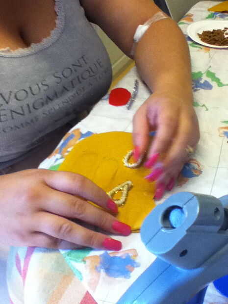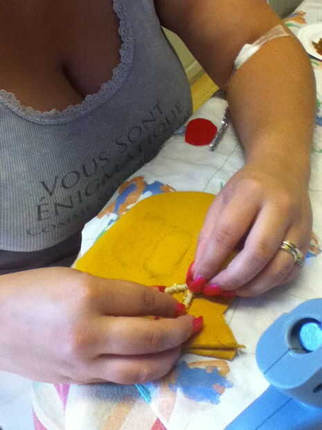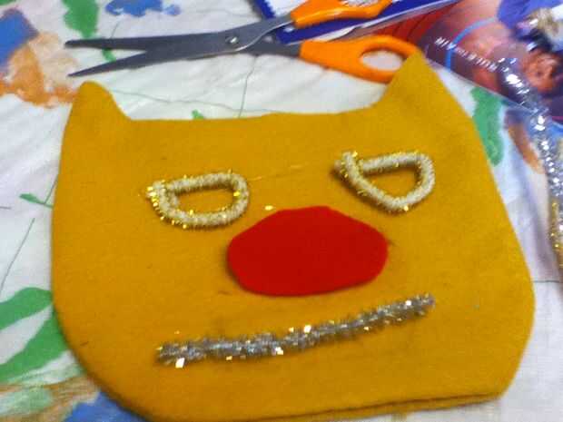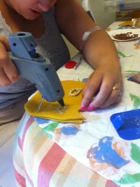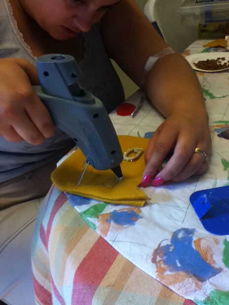 Antes de que pega en los ojos y la nariz, me colocó abajo en la tela y ligeramente había marcado estos espacios.  Luego caliente pegado y colocado hacia abajo las piezas sobre el pegamento.  Hice este un ojo / nariz en un momento para que el pegamento no seque antes de llegar a la pieza.