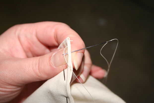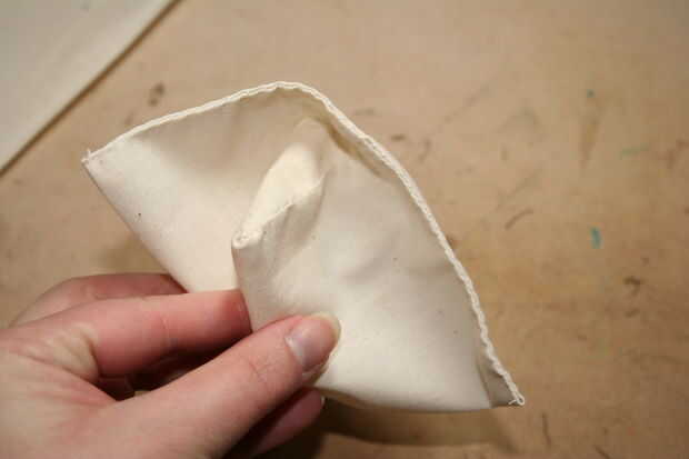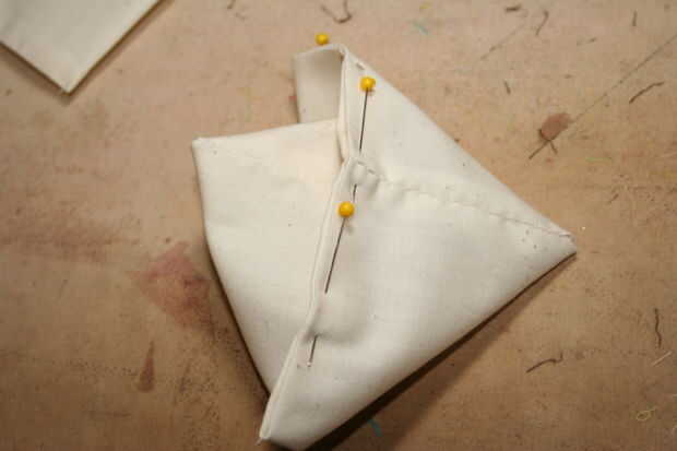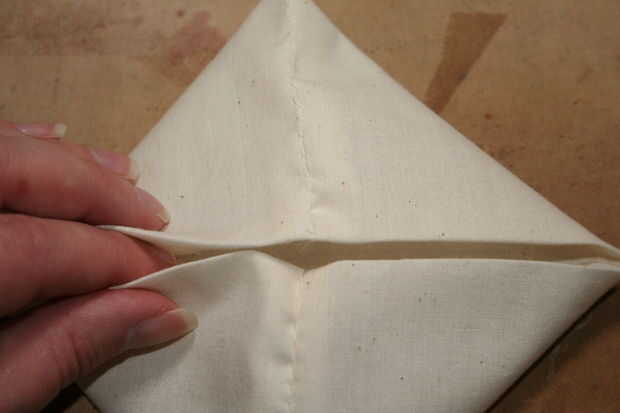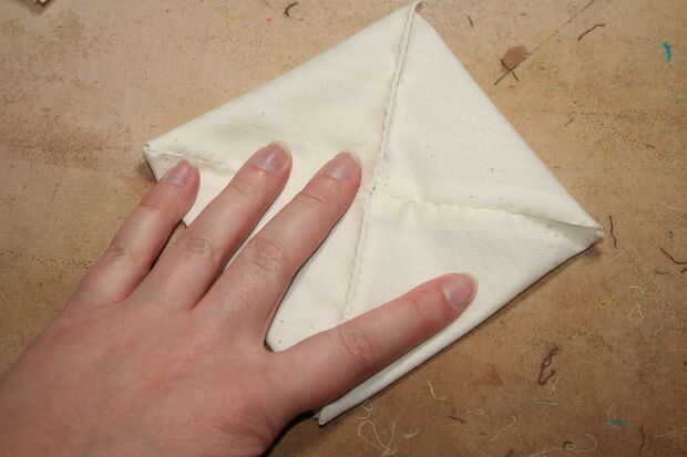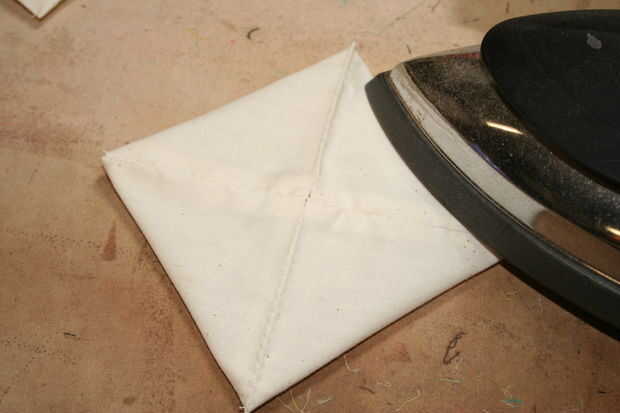 Cuando haya terminado esta costura, aplanar su pieza en un cuadrado, con sus costuras formando un X en el centro de la Plaza. Pulse el botón plano.
