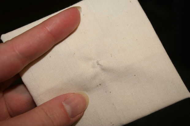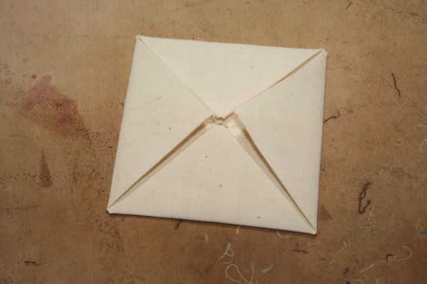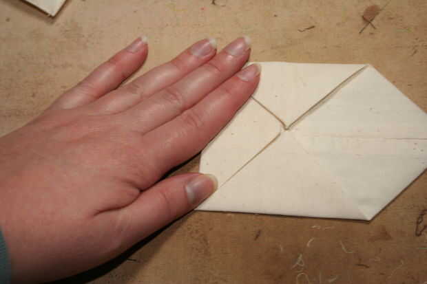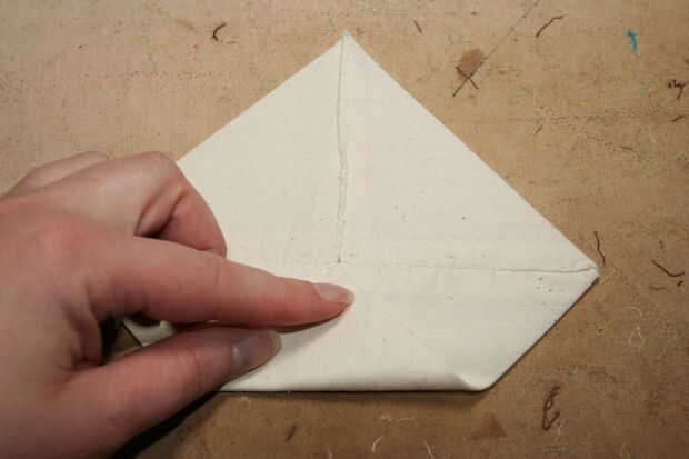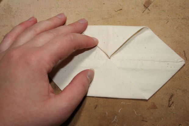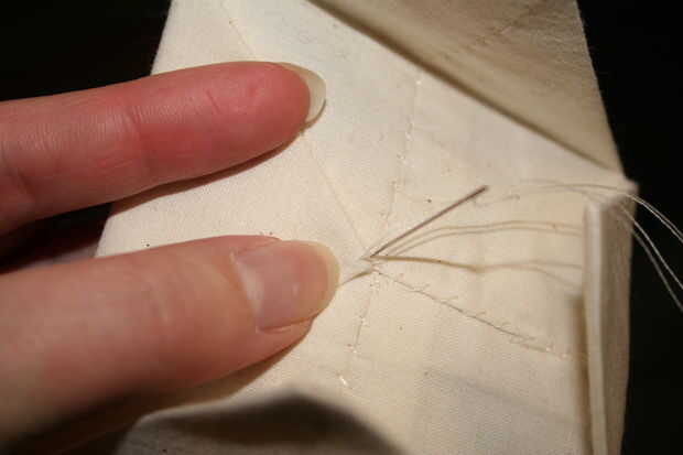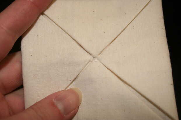 Una vez que tengas tus esquinas presionadas, puntada justo la punta de cada esquina en su lugar. Usted querrá pasar por todas las capas de tela aquí y asegúrese de que cada esquina está muy bien colocado, ya que habrá un poco de tirón en estas puntadas en un futuro paso.