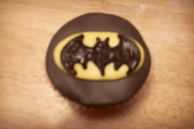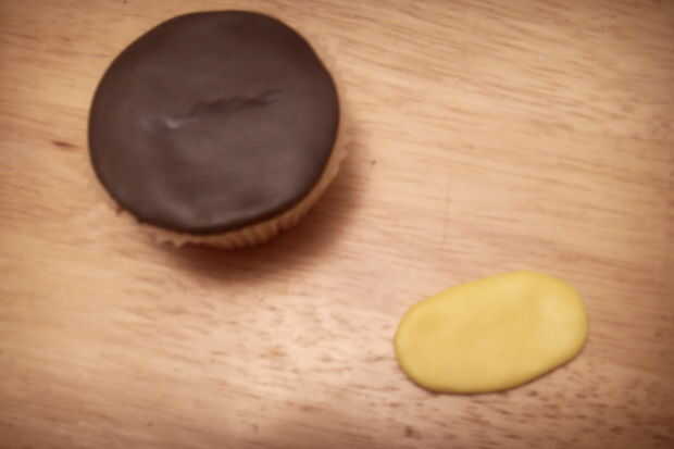 Lanzar una gran bola de pasta de azúcar amarillo y aplanar en un óvalo o estirar un trozo de pasta de azúcar y cortar la forma ovalada. Esto pega a tu torta de la taza.