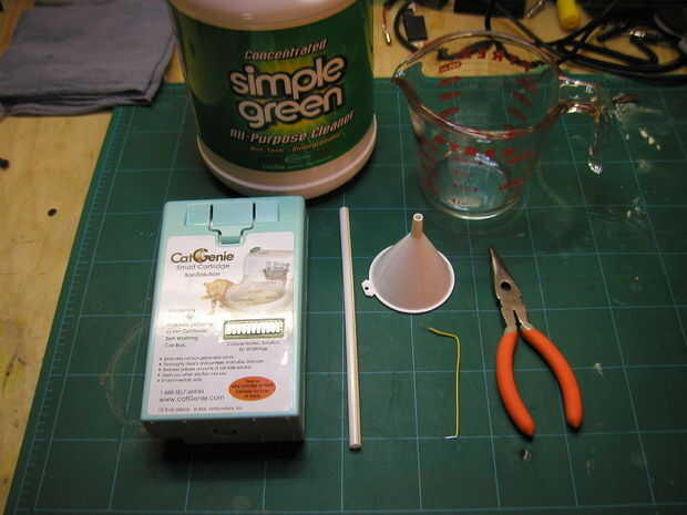 Elegir tu propia solución para rellenar el cartucho con, así que tome todas las precauciones necesarias. Te recomiendo guantes y gafas de seguridad si usted es el menos pedacito seguro de conseguirla en el ojo o en la piel. Estoy usando Simple Green", que es bastante inoccuous, pero todavía recomiendo los lentes de seguridad.