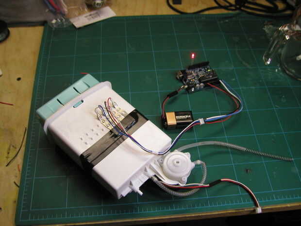 Conectar la batería (o USB - recuerda el puente) a la Arduino y dar aproximadamente diez segundos que carga el programa y sale corriendo. Realmente no habrá ningún indicio de que está listo - supongo que podría añadir software para eso más adelante.