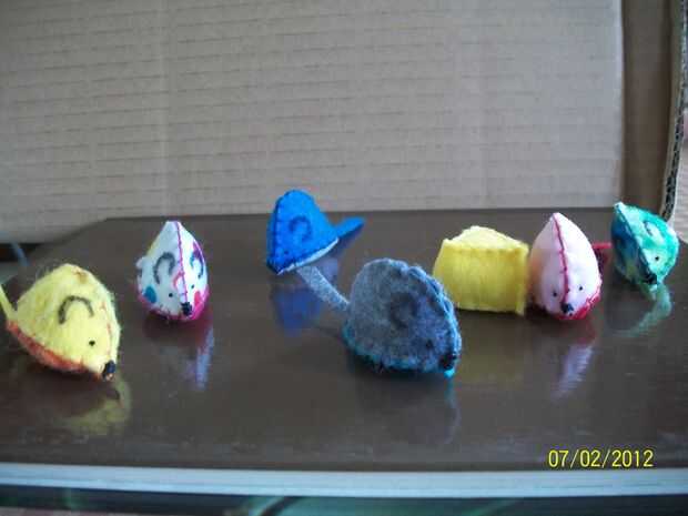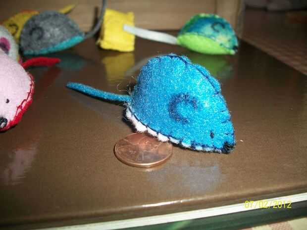 Trazar el patrón sobre el fieltro y un trozo largo y fino para la cola. Coser las piezas dos laterales juntos a lo largo de la parte superior (yo usé una puntada banket) luego coser la cola. A continuación comience a coser en la parte inferior del ratón con la cola en el interior del ratón. Al llegar mitad de camino alrededor del ratón añadir la hierba gatera y el relleno, luego termine de coser cerró. Esta parte es opcional, pero pensé que fue más lindo, he usado nuevo hilo para la nariz yendo una y otra vez el mismo punto luego usando el mismo hilo fui a un lado y utilizar un nudo de un ojo luego sigue usando el mismo hilo pasó al otro lado y utiliza otro nudo para el otro ojo , luego bajamos el pack a la nariz y usa un nudo para atar el hilo. para los oídos usé un marcador permanente. Y luego la mejor parte, gatos disfruten su nuevo reloj. :)