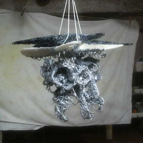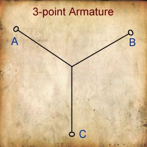 Puesto que tres puntos definen un plano, para colgar su trabajo (el plano imaginario) en cualquier posición ayuda a tener tres puntos de anclaje de la armadura. La armadura puede ser de un material rígido, como alambre de hierro o un material flexible, como cadena. Si usa cadena, la escultura todo será tambaleante, como el caucho 100% y puede que necesite conectar a un marco rígido temporal para su control. Una armadura rígida añade rigidez a la escultura y no necesita un temporal funciona marco. Como se puede ver en las fotos de abajo, una armadura con tres puntos de sujeción no es una necesidad absoluta. Es sólo un principio básico útil.