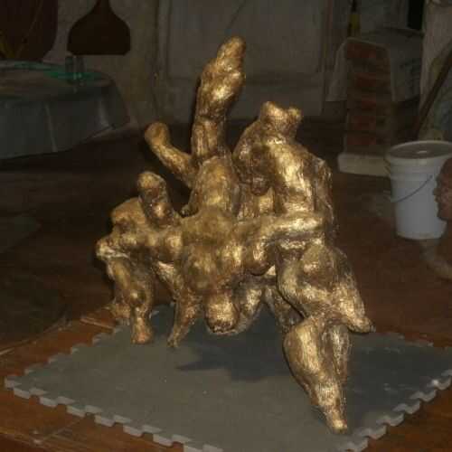 Esta escultura utiliza una armadura de tubería de PVC.  Las formas fueron entonces construidas con arcilla sobre la armadura.  Una capa de silicona cubre la arcilla.  Cuando el caucho se endurece hacia arriba, cortar la silicona para sacar la arcilla, parche de la silicona y luego lo colorear.  La pintura no se pega a la silicona.  Usted puede hacer un sustituto de la pintura mezclando polvo de pigmentos con silicona transparente y cepillar o frotar sobre la superficie.  En este caso, utilicé pigmentos metálicos y claro del silicón.