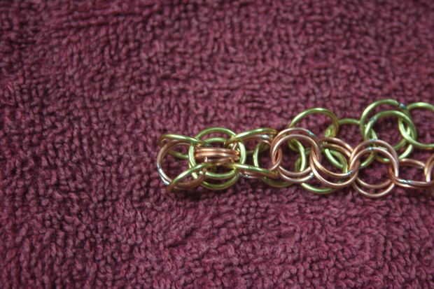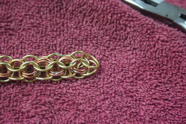 Al final de cada cadena, cerrar los anillos de latón con dos anillos de cobre amarillo corriendo horizontalmente, uno arriba y otro por debajo de los anillos de cobre. Esto hará que los anillos que se coloque el candado para cerrar la pulsera.