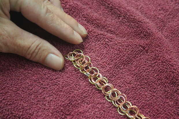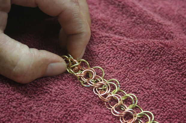 Cuando se han capturado todos los cuatro anillos de bronce, apriete el anillo abierto cuidadosamente cerrado con sus alicates de punta.