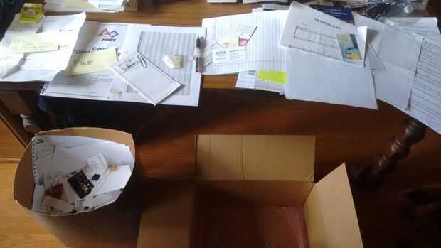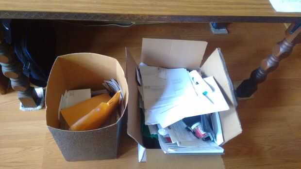 Su caja stash debe bajar en volumen, mientras que los contenedores de basura y reciclaje y donación de suben en volumen. Tendrás un par de cosas en montones separados más pequeños en el escritorio, pero vas a actuar en eso, no dejarlos allí.