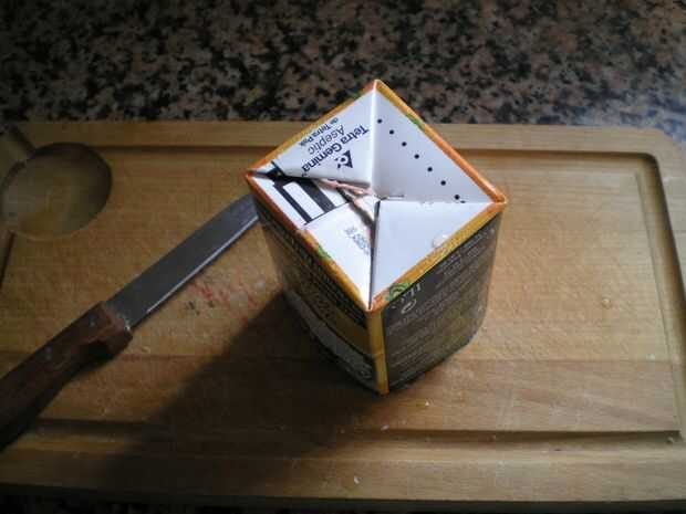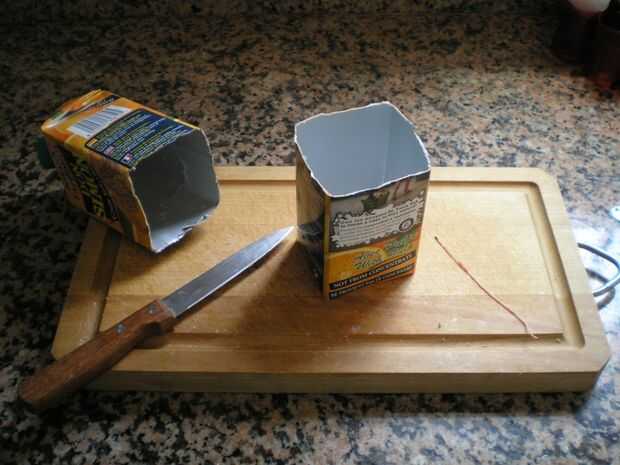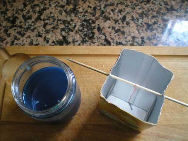 Corta el brik por la mitad y enjuagalo. Haz un agujero en el culo para la mecha y usa el palito para mantenerla derecha.