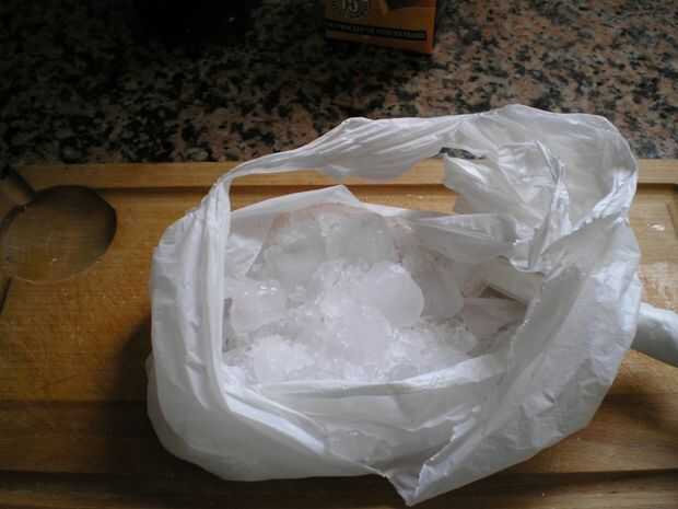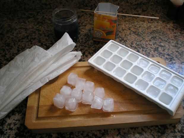 Poner hielo picado en el molde y verter sobre la cera caliente. No te preocupes si no hay ningún espacio para la cera. Se funda el hielo creando caminos extraños. Debe cubrir todo el hielo, porque la parte superior será la parte inferior de la vela terminada. No mueva el molde en la hora siguiente.