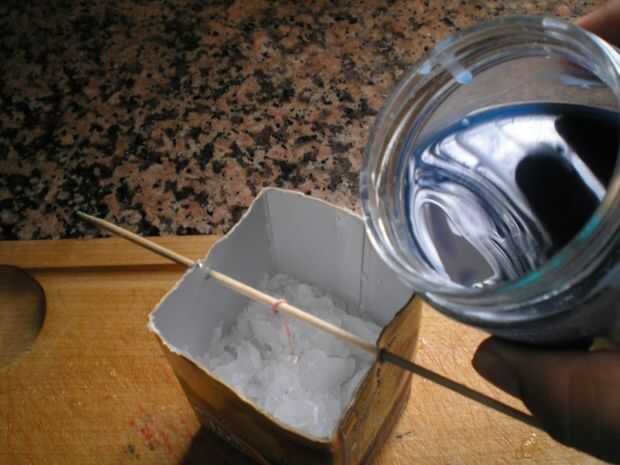 Si quieres una vela sólida, no usar hielo. Simplemente Vierta la cera caliente en el molde, pero debes esperar más de una hora. En este caso, recuerde que la cera reduce su volumen cuando se enfría.