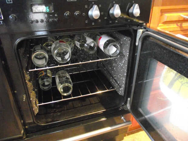 Algunos frascos limpios en un horno caliente de calor