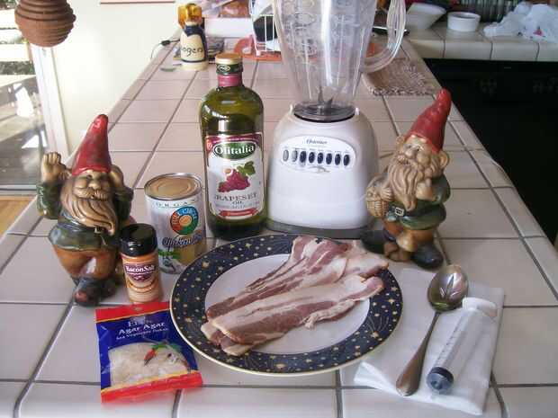 ¿Qué es esto? Esta es mi receta para un postre "flan-como" frijol con un esmalte gelatinoso de arce/bourbon con tocino fresco desmenuzado en la parte superior. Tiene un dulce sabor de los frijoles y arce, un toque de tiro desde el bourbon, una s