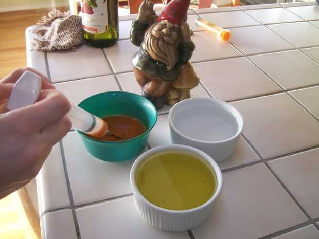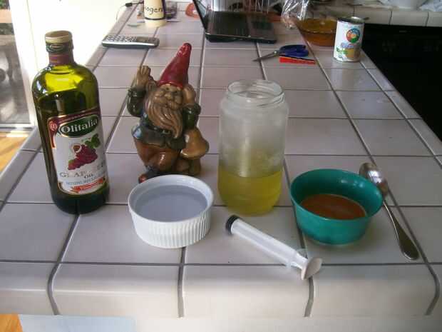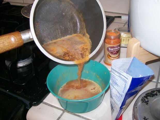 Vierta la mezcla en un bol. tienes que trabajar con rapidez porque establece rápidamente. tomar el aceite frío del congelador y vierta en un recipiente poco profundo. llenar otro recipiente con agua fría y configurar su estación de caviar con todo a mano. LLENE LA JERINGA!
