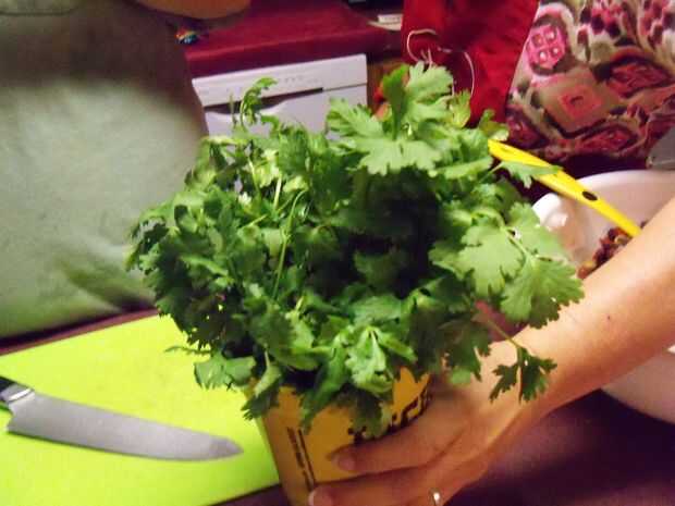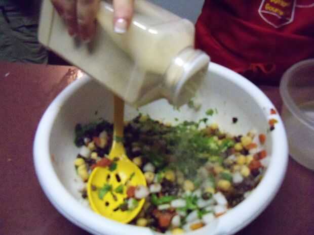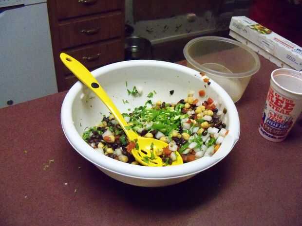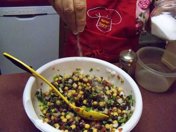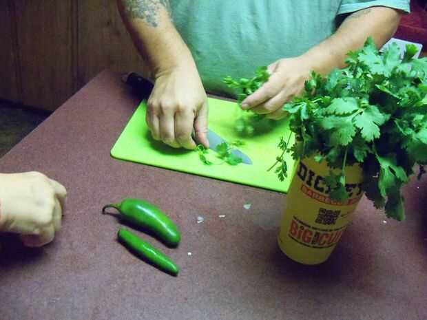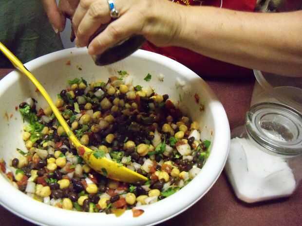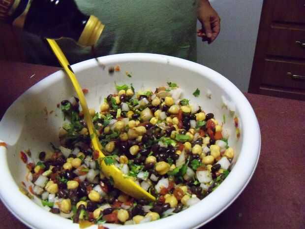 Un poco de cilantro y dados para arriba también; un pequeño truco para cuando dice arriba, no romper los tallos pero más bien doblarlas por la mitad para cortar en cuadritos. Esto ayuda a liberar el sabor y hace más fácil picar. Después de agregar, vaya por delante y dice arriba un jalapeño y un pimiento serrano; puede sacar las semillas y las venas (que le quita el picor de los pimientos) o dejarlas en si te gusta un poco picante. Después se mezcla en el material picado, seguir adelante y mezclar otra vez. Ahora tiempo para agregar algunos fuera de sabor. Espolvorear sobre algunos ajo en polvo, sal (muy poco) y pimienta negra, haciendo todo esto al gusto. Luego seguir adelante y tomar alguna vinagreta balsámica y vierta allí, cata a medida que avanza. A veces los garbanzos absorberá mucho de los jugos extras y el caviar parecerá seco. Si esto sucede, vierte un poco aceite de oliva y luego mezcla en alguna vinagreta más y usted debe ser bueno.