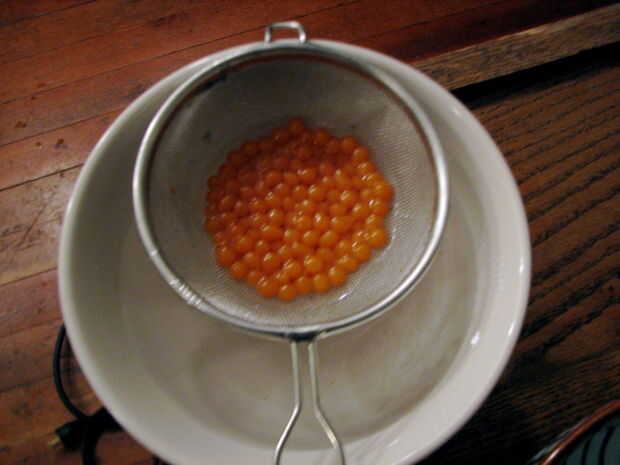 Pasar el colador con el caviar de la solución de cloruro de calcio en un baño de agua regular.