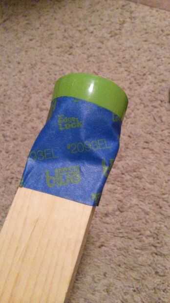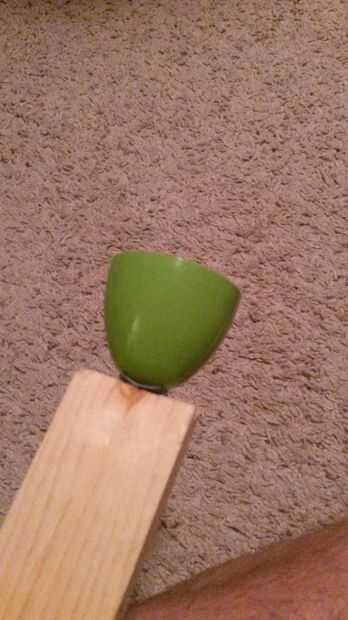 Coloque la mitad de uno de los huevos de plástico al final de la madera de 1 x 2 usando la cinta adhesiva echada a un lado doble. El huevo debe conectarse con el exterior del huevo el extremo del palo. También envuelve cinta adhesiva alrededor de la 1 x 2 y la cáscara de huevo media para proporcionar cierta estabilidad adicional. el esta herramienta le permitirá un medio para el transporte de los huevos en el techo.