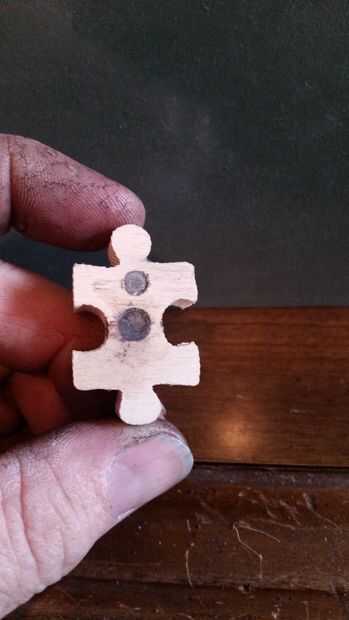 Los otros cuatro son piezas del puzzle que se cortan de la madera de la cara de la caja y los imanes de neodimio se pegan al ras en los orificios perforados en la parte trasera de cada pieza.