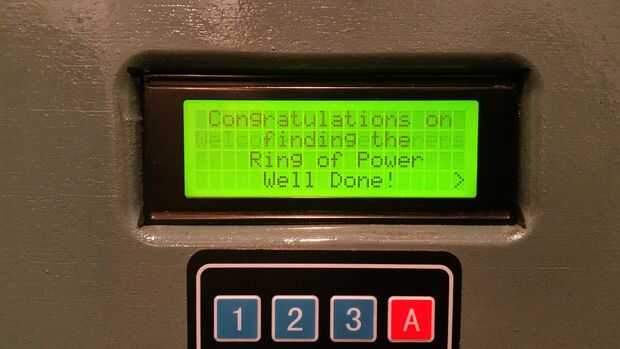 Primero se descubrió el "anillo de poder". Esto agitó a un secreto lugar justo debajo del teclado. El imán activa un interruptor de láminas y el Arduino se enciende mediante un controlador de potencia de chip (más sobre esto más adelante). La pantalla LCD se enciende y dice el equipo dónde buscar la pista siguiente. Después de un corto tiempo el Arduino se desactiva para ahorrar energía también mediante el controlador de chip. Los buscadores se ejecutan sobre buscar y resolver acertijos y finalmente se recupera la primera "clave". El anillo de poder se agitaban sobre el punto otra vez para alimentar la caja y la llave se coloca frente a la caja. La clave es reconocida y entonces se da la siguiente pista. Hay una oportunidad para repetir la pista si es necesario. Si no, Arduino el tiempo de espera, activa el interruptor de Pololu y poderes hacia abajo. Esto sucede para el resto de las teclas hasta que los cuatro se colocan frente a la caja.