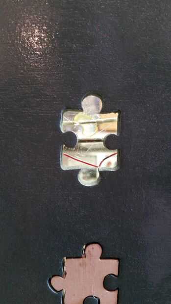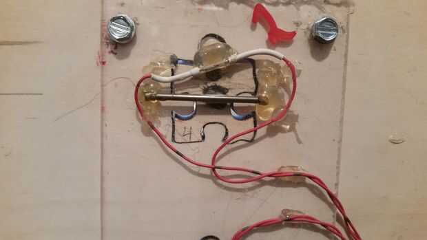 Tornillo en ambas piezas de plexiglás centrado sobre los agujeros de la pieza de puzzle. Luego inserte una pieza de su agujero y ve por la parte posterior. De la parte trasera, pegamento caliente una pequeña franja de metal en el imán del centro de la pieza del rompecabezas para que tu pieza se pega a él. Conecte el interruptor de láminas a un voltímetro. Cuando usted pone el interruptor de láminas en gama del imán se cerrará. Pegamento abajo mientras sigue conectado al voltímetro para sepa que se activa cuando se inserta la pieza. Hacer esto para todas las cuatro piezas. (ver imagen)