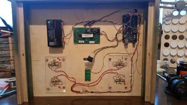 Escogí un lugar al azar para el interruptor de láminas de "anillo de poder" debido a espacio. Se puede colocar dondequiera que usted tenga gusto. Mina coloqué debajo del teclado para que el "anillo de poder" debe colocarse en ese punto. Este interruptor está conectado al interruptor de Pololu. Este interruptor conecta el + 6 voltios de la batería al puerto de "on" del interruptor de Pololu. En el lado opuesto de la madera contrachapada coloqué una calcomanía que tenía el mismo emblema como el anillo de poder. Luego mandó el equipo de "lugar del sello del anillo contra el sello en la caja" así supe que se activa constantemente.