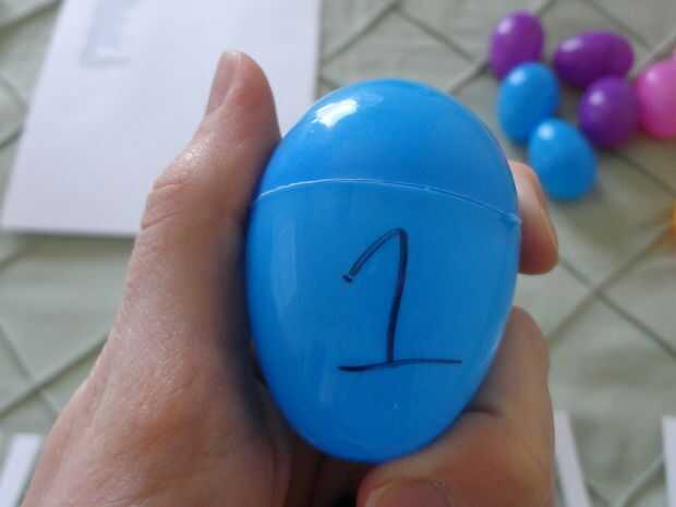 Cortar pistas, asegurándose de mantener en orden. Rellenar los huevos de Pascua con pistas y numerarlos 1-18.