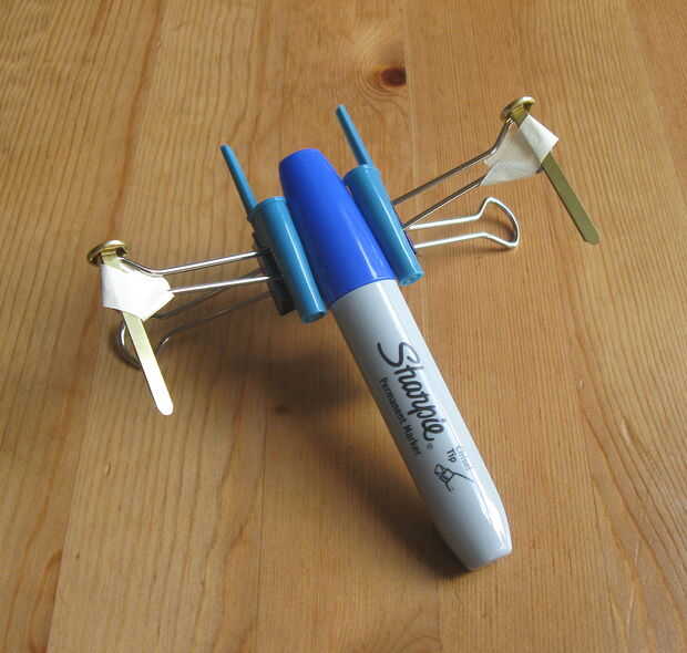 a partir de la parte inferior, pegar las tapas de pluma en lugar de propulsores (supongo que se puede utilizar cinta y pegamento se ve mucho más agradable). Pegar dos de los sujetadores en las alas de la parte inferior de cañones. Cinta les sostenga en su lugar mientras el pegamento seca.