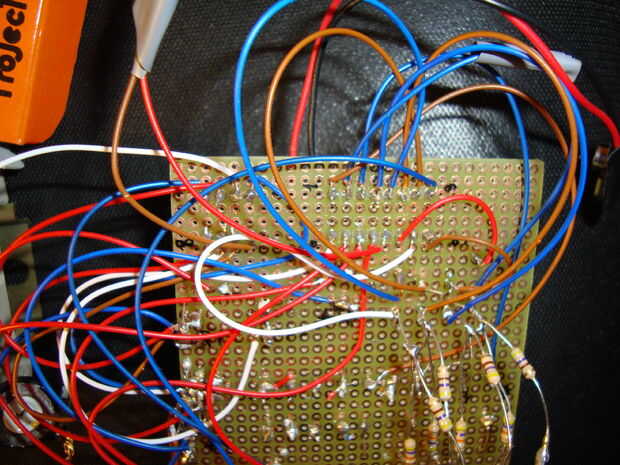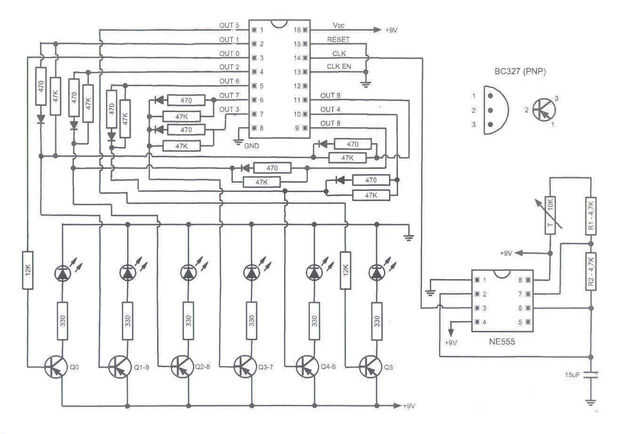 Como se puede ver en el circuito esquemático, cada LED del medio está controlado por dos salidas. Si son ambos bajos (para que ponga la señal negativa) el perno central del transistor se suministra con una resistencia de 23, 5 K(debido a los diodos la corriente no fluye a través de las resistencias bajas).