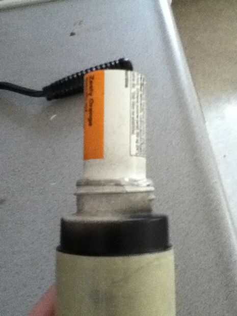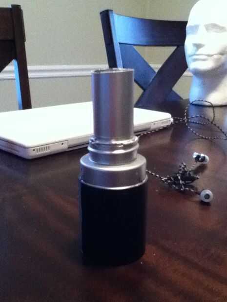 Este paso es similar la lente pequeña. Tomar a un Philips grande contenedor y un contenedor de aire. Me corte la parte inferior de la Philips y échalo de ti. Tome la tapa del contenedor aerotransportada y tirar el resto a través de, la parte donde va el cap debería impedir que ir más lejos. Marcar donde quieres cortar el aire y sacarla. Córtala y échalo de ti. Ahora tire de ella a través de y pegamento caliente sobre (usted puede incluso utilizar el pegamento caliente para que se vea como una soldadura. Ahora repita el paso con el pasador desde el último paso y toda la cosa la pintura negra. Poner alguna cinta de enmascarar en el grove segundo y pintura plata.
