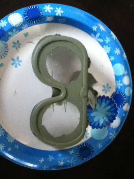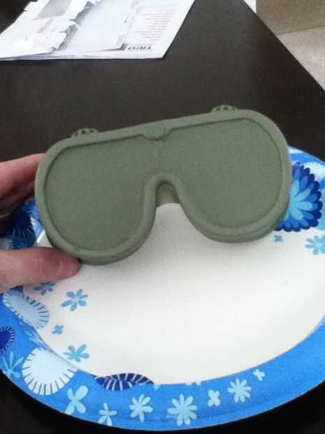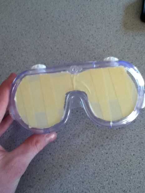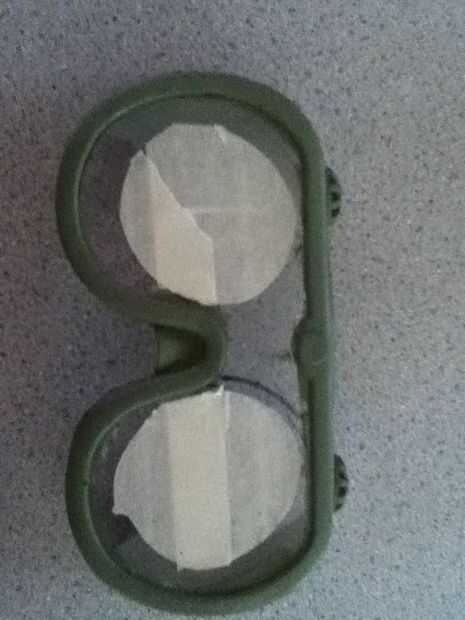 Tomé algunos cinta de enmascarar y graba el interior de las gafas. He trazado la lente y cortar con un cuchillo X-acto. He quitado el área alrededor de la cinta y había pintado con pintura en aerosol verde camuflaje. Me quité la cinta y el área que enmascarado era todavía claro. Pegué las lentes de las gafas.