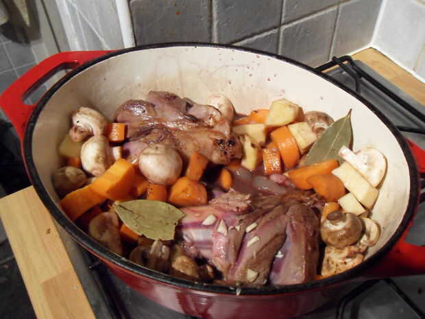 Llevar a hervir, dejar por 5 minutos y coloque en el horno a 200C durante 3 horas. (Sí, 3 horas!)