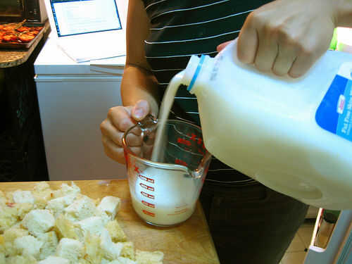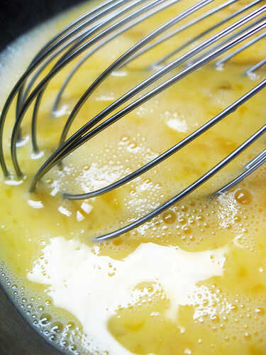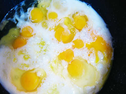 En un bol grande, batir los huevos, leche, crema, nuez moscada, pimienta, sal y pimienta. Ponga a un lado.