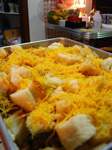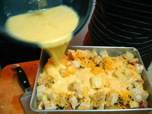 Esparcir 1/2 del queso en el fondo del plato con mantequilla, cubrir con 1/3 del pan y luego 1/2 de la mezcla de tomate. Repetir. Cubra con una capa final de pan y el resto de queso. Verter la mezcla de huevo sobre los estratos y presione suavemente hacia abajo con el dorso de una cuchara grande para asegurarse de que la capa superior se humedece con la natilla. Derretir el resto de 1 T. de mantequilla y llovizna sobre los estratos. Cubra con envoltura de plástico y refrigere durante la noche.