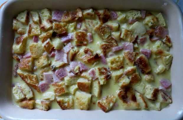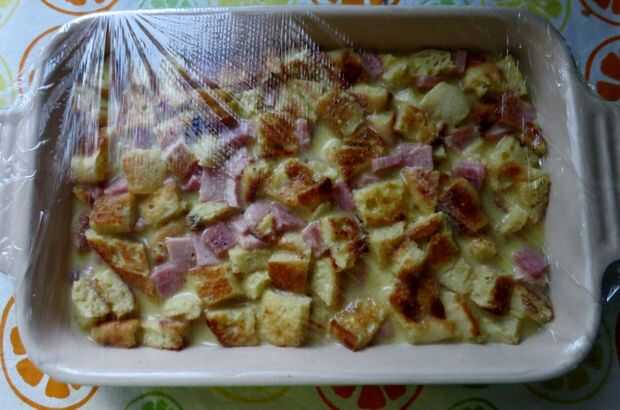 En un bol grande, batir huevos, leche, cebolla en polvo, sal y pimienta; verter encima del jamón y muffins. Cubra con envoltura de plástico y refrigere durante la noche (o alrededor de 8 horas si usted está haciendo para la cena).