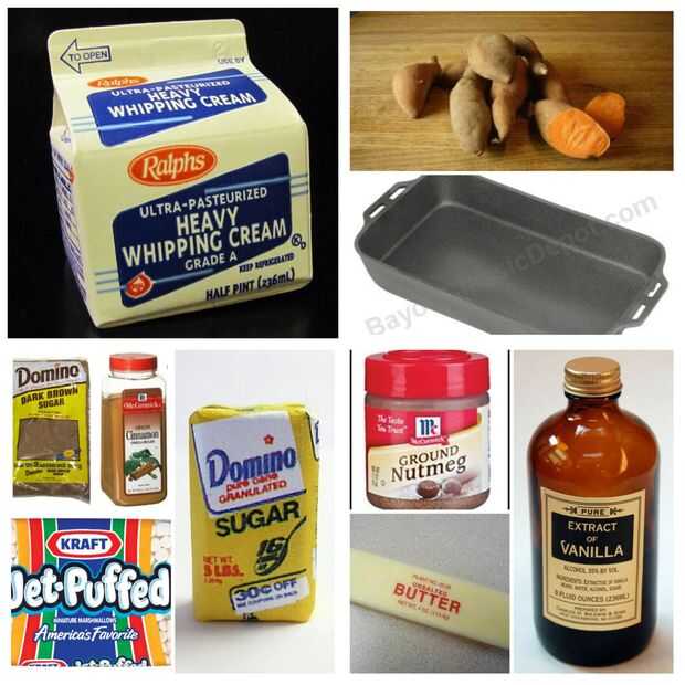 Los ingredientes incluyen crudo, 6 rodajas de batatas, 1 bolsa de malvaviscos, 1 cucharadita de canela, 1/2 taza de azúcar morena, blanca de 1 1/2 taza de azúcar, una pizca de nuez moscada, un palo derretido de mantequilla, 2 cucharaditas de vainilla y 1/4 taza de crema de leche. Usted también necesitará un horno seguro, plato de la cocina.