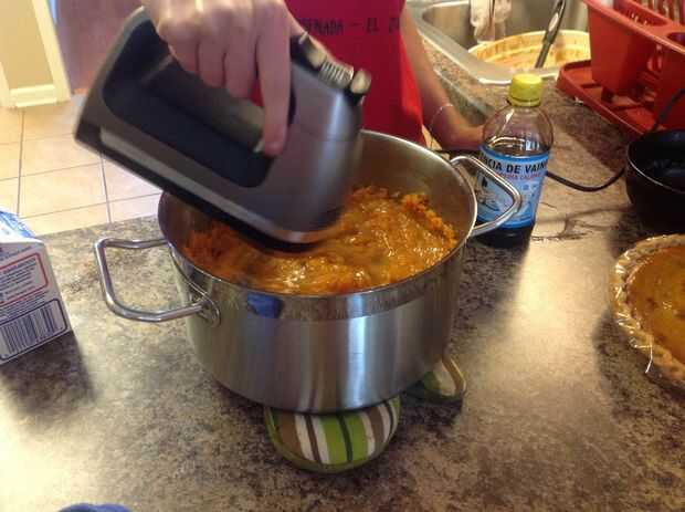 Con un mezclador de mano, mezclar los ingredientes hasta que estén completamente mezcladas. La mezcla debe tener una textura suave y naranja.